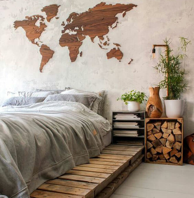 Vous pouvez également rester simple avec des panneaux de bois mat ou utiliser des accessoires pour apporter plus de masculinité dans la pièce. Un tapis en peau d’ours ne convient peut-être pas à tout le monde, mais c’est la pièce d’accent parfaite pour une chambre à coucher rustique.