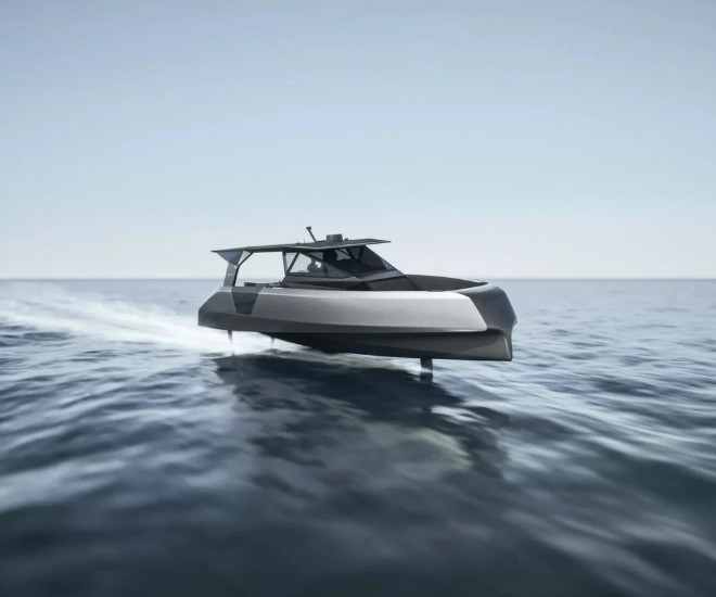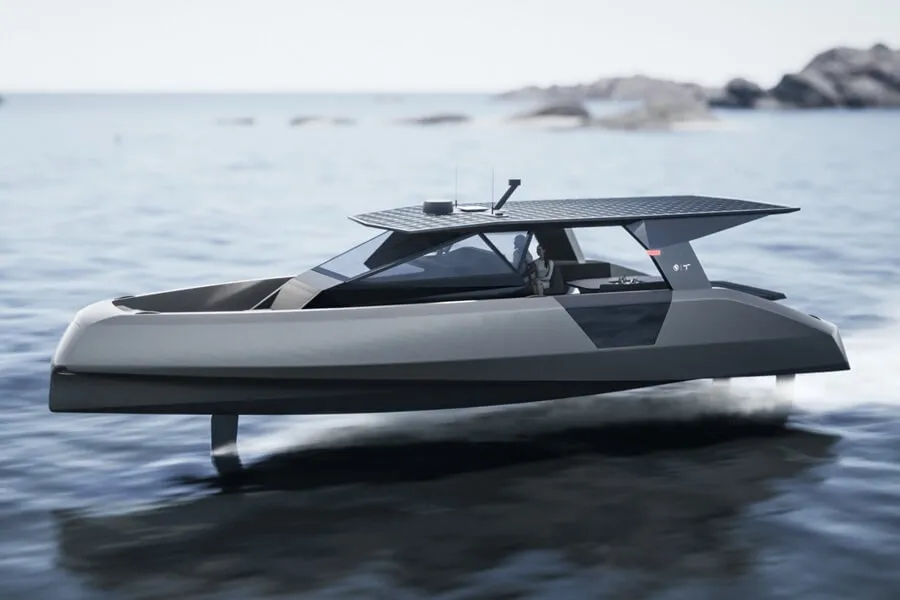 Tyde développe également The Open, un bateau électrique de 48 pieds doté lui aussi de trois foils mais conçu comme un day boat de luxe, avec un aménagement ouvert et un grand hard top recouvert de panneaux solaires. Le pont principal comprend un bain de soleil arrière, une longue table flanquée de canapés, un poste de pilotage avec banquette, un pont avant avec canapé et un lit de soleil escamotable, ainsi qu’une cabine sur le pont inférieur avec un lit double, une grande télévision, un bureau et une salle de bain attenante.