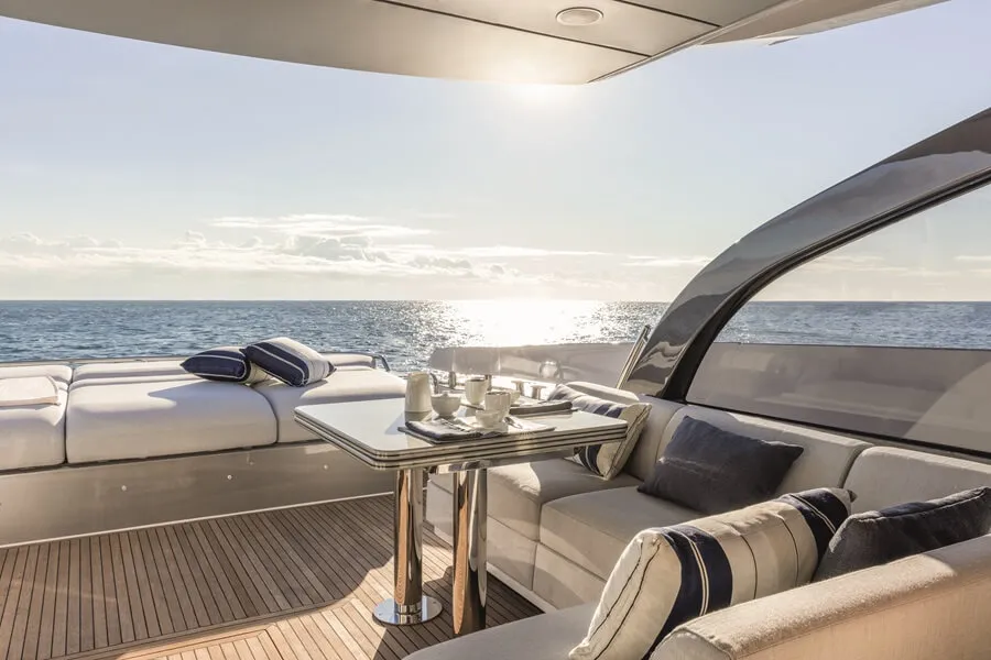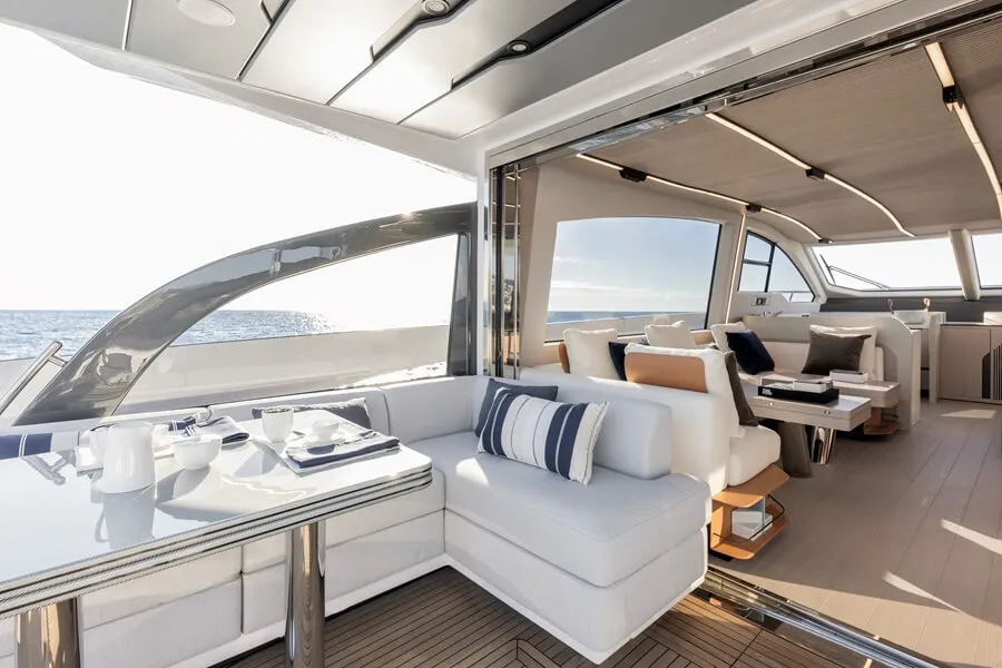 En plus du bain de soleil ouvert, le cockpit dispose d’un salon/salle à manger avec un canapé en forme de L couvert par le porte-à-faux du flybridge. Cette zone bénéficie d’une protection supplémentaire contre les tôles de mode qui abritent sans enfermer grâce aux grands panneaux de verre qui y sont insérés. Un meuble bar situé près de l’escalier menant au flybridge peut être équipé d’un évier et d’une machine à glaçons ou d’un mini réfrigérateur.