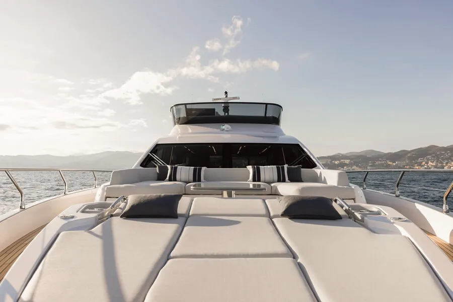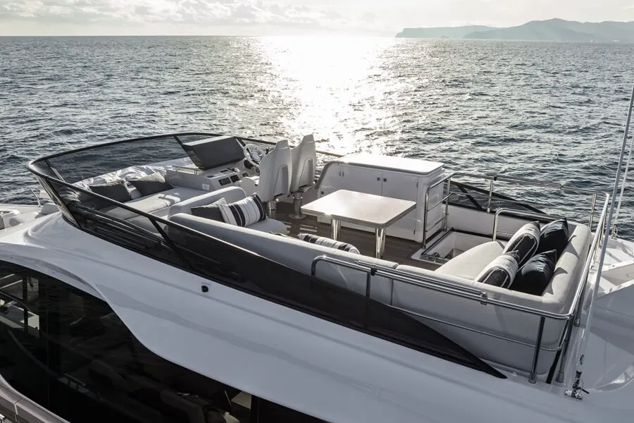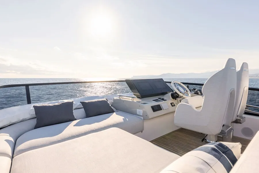 Le double bain de soleil près du poste de pilotage est équipé d’appuis-tête arrière qui se transforment en dossiers pour s’asseoir autour de la table à manger, un petit détail qui en dit long sur la réflexion et la planification qui ont été menées pour tirer le meilleur parti de chaque centimètre carré à bord.