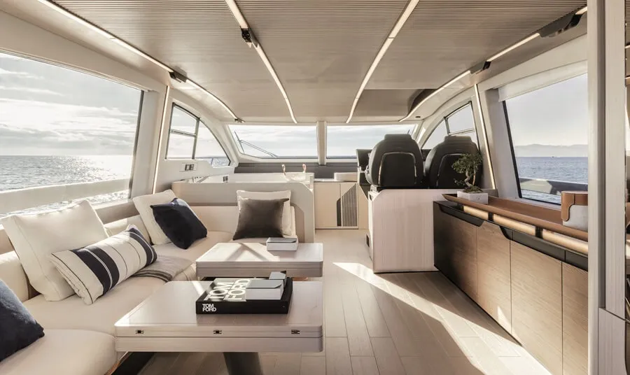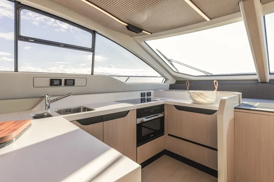 Le fly comprend une table à manger en fibre de carbone avec des banquettes en L à bâbord et à l’arrière, face à un meuble wet bar avec un grill et un réfrigérateur à tribord, à l’arrière du poste de pilotage biplace.