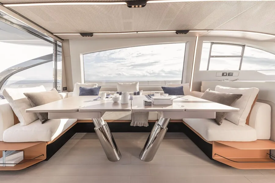 Le sport et le plein air vont de pair et, en tant que bateau de sport, même les intérieurs du S7 gardent un œil sur la vie en plein air. Conçu pour une circulation aisée et une connexion continue entre les espaces, le salon semble être le prolongement naturel du cockpit arrière.