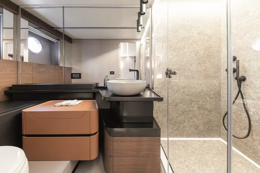La cabine VIP avec salle de bain à l’avant a des murs incurvés pour suivre la forme de la coque, tandis qu’il y a deux cabines jumelles, une avec des lits orientés vers l’avant à bâbord et une version à tribord avec des couchettes croisées. Une cabine d’équipage pouvant accueillir deux personnes dispose d’un accès séparé depuis le passage du pont latéral.