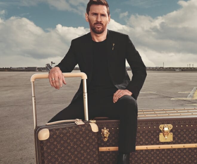Dans une nouvelle campagne de voyage intitulée « Horizons Never End », le champion du monde de football Lionel Messi n’a que sa valise Horizon avec lui. Dans une séquence de photos prises par le photographe de mode et vidéaste Glen Luchford, on peut voir Messi assis dans un terminal d’aéroport, les jambes écartées sur sa valise cabine roulante Horizon. Dans une autre image, l’icône du football est assise sur une célèbre malle Louis Vuitton placée parmi les avions sur le tarmac, prête à s’embarquer pour des voyages exotiques avec ses bagages Horizon.