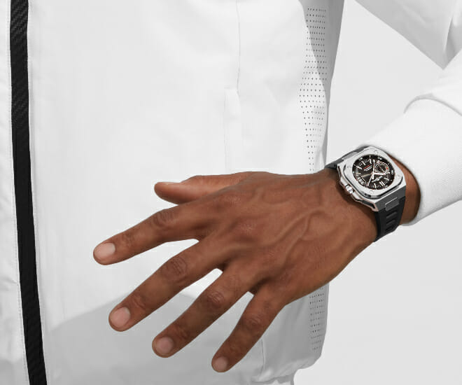 En ce qui concerne le boîtier et les variantes, il y a trois options différentes, avec jusqu’à cinq versions (en fonction de la définition que l’on en donne, selon Rosillo), la variante à cadran bleu glacier en acier étant particulièrement attrayante. D’autre part, la version orange et noire en carbone forgé, titane et acier met en valeur la nouvelle structure du boîtier en plusieurs parties. Comme on peut s’y attendre, il s’agit de la version la plus chère de la BR-X5, par rapport à la BR-05. Il s’agit d’un saut quelque peu conservateur, tout bien considéré. Toutes les versions sont étanches à 100m. Les versions avec bracelet en caoutchouc sont à S$9,700, tandis que les options avec bracelet sont à S$10,500. La pièce finale, de couleur orange, coûte 16 700 $.