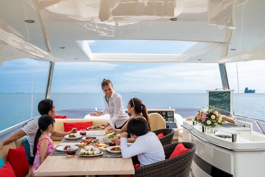 Ce yacht exceptionnel de 24 mètres offre un service cinq étoiles exclusif, avec une cuisine raffinée et des équipes d’accueil formées par des experts de l’InterContinental Phuket Resort, qui garantissent un voyage haut de gamme. C’est un peu comme si vous séjourniez dans un hôtel cinq étoiles flottant.