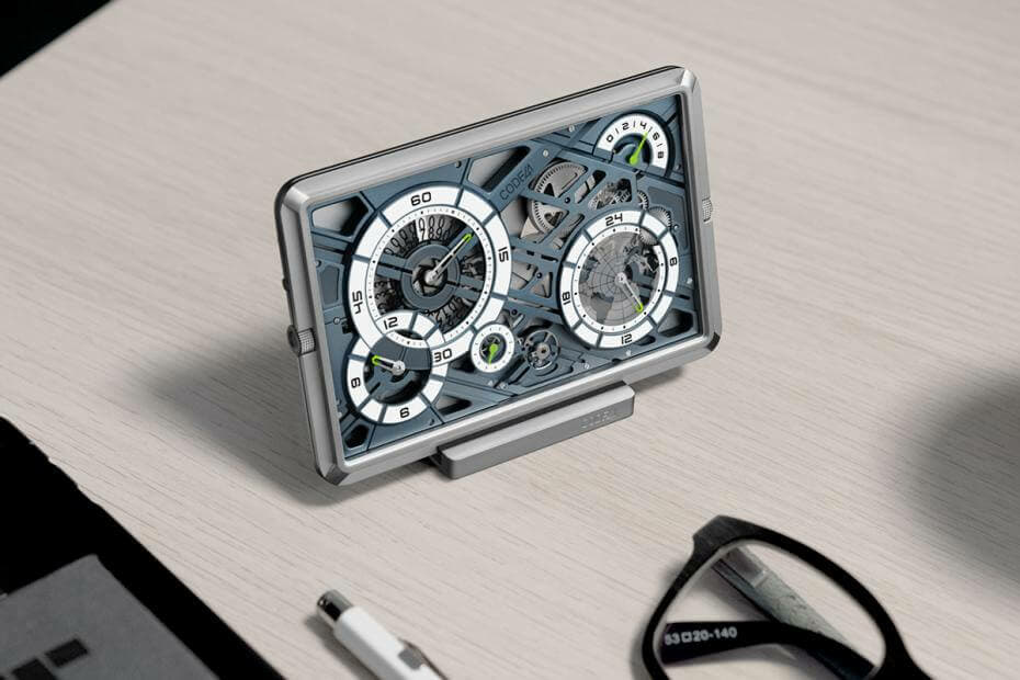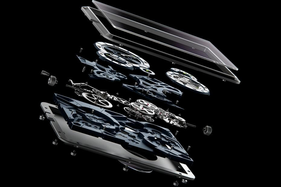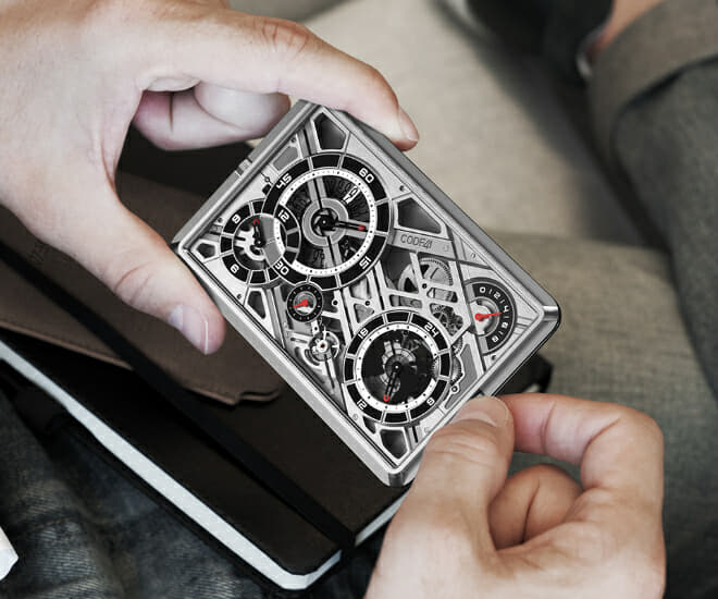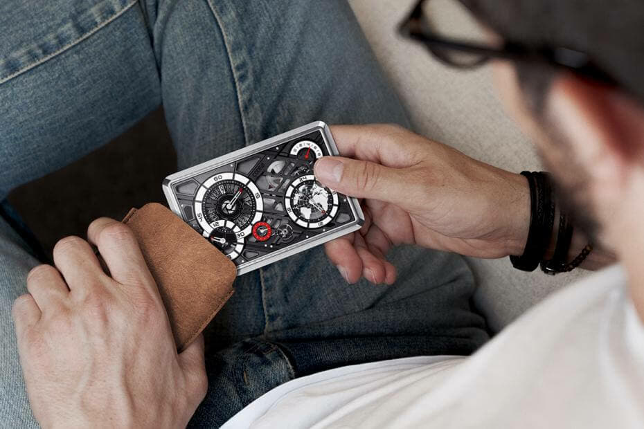 La Mecascape est protégée par un verre saphir antireflet et le fond du boîtier est en titane grade 5 massif. Une petite ouverture au dos permet de jeter un coup d’œil sur les parties mobiles du garde-temps. Créée en collaboration avec l’atelier d’horlogerie indépendant Cercle des Horlogers, l’atelier a géré de manière experte les difficultés techniques de la fabrication de la montre. Des dimensions sans précédent au processus complexe de calibrage et à l’intégrité structurelle. Deux accessoires accompagnent la Mecascape : un support métallique qui permet de la positionner verticalement et un étui de voyage en cuir italien de haute qualité doublé de microfibre.