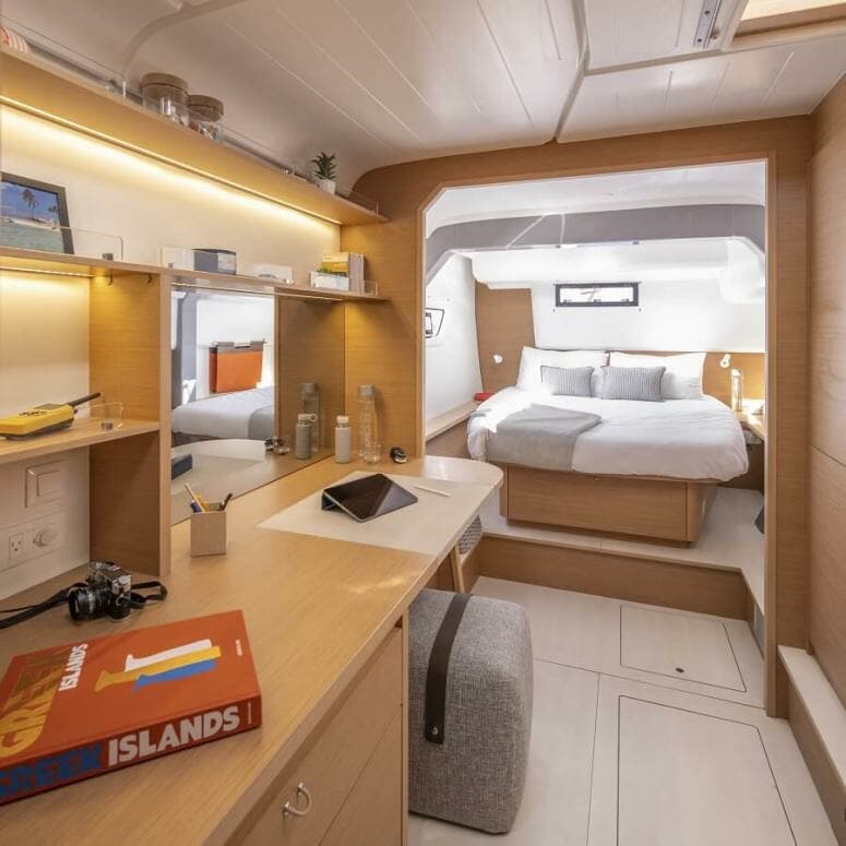 La version à trois cabines comprend une grande suite principale sur le côté tribord avec un bureau au milieu et une salle de bain à l’avant. Plus à l’avant encore se trouve une buanderie qui peut servir de dressing ou de pièce de rangement pour les équipements et le matériel de sports nautiques, ou qui peut être aménagée avec des lits jumeaux, idéal pour une famille avec des enfants.