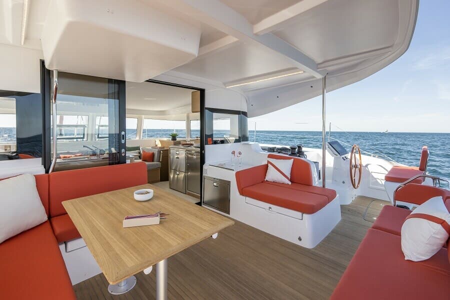 En termes d’espaces sociaux extérieurs, le cockpit comprend un large canapé à l’arrière, un canapé en L et une table à manger à bâbord, ainsi qu’un canapé ou une chaise longue à tribord. Le pont avant est propre, mais peut être aménagé avec deux bains de soleil à dossier réglable. Il y a également la possibilité d’installer un » skylounge » de style flybridge sur le toit de la cabine, mais il ne peut être utilisé qu’au mouillage en raison de la flèche basse.
