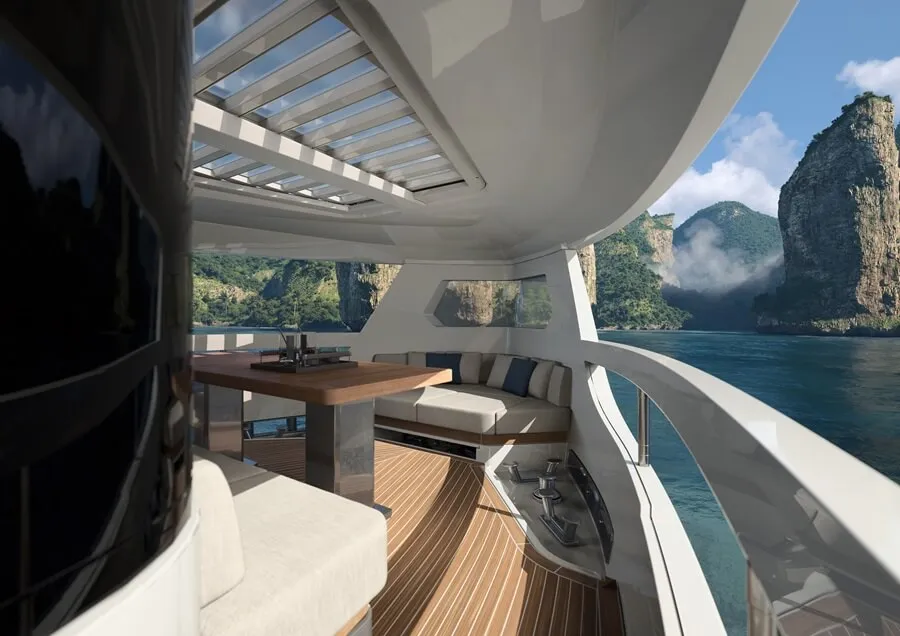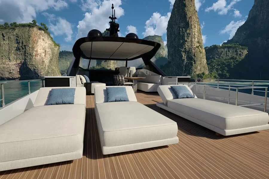 Le flybridge standard est totalement ouvert, bien que les propriétaires puissent choisir un flybridge semi-fermé avec des panneaux en verre, tandis que le hard top fixe fournit de l’ombre pour la salle à manger supérieure. Le flybridge arrière est équipé d’une cuisine extérieure et d’un espace dégagé pour les meubles autoportants tels que les chaises longues.