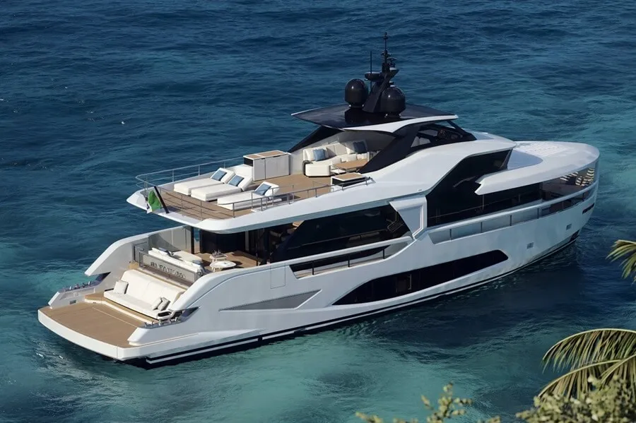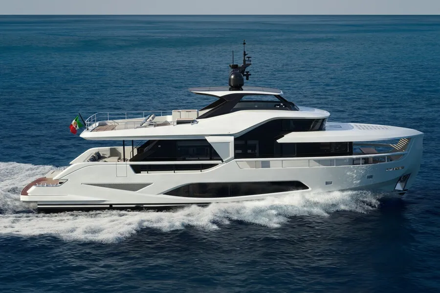 D’une longueur totale de 23,7 m et d’une largeur de 6,36 m, l’Infynito 80 présente des extérieurs signés Filippo Salvetti et des intérieurs signés IdeaeItalia. Il a été conçu en collaboration avec le Comité stratégique des produits du Groupe Ferretti, présidé par Piero Ferrari, et le département d’ingénierie de l’entreprise.