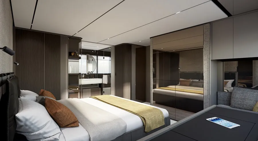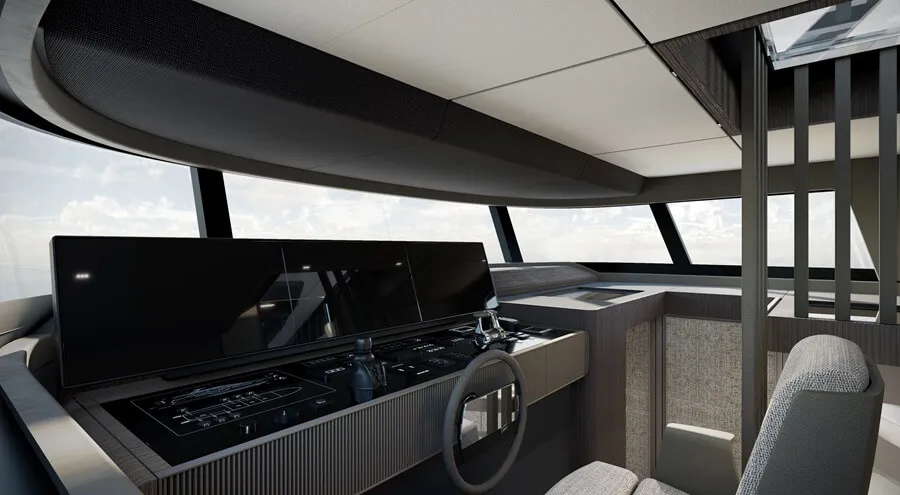 La zone de plage dispose d’une plate-forme arrière avec un ascenseur linéaire pour la mise à l’eau et la remontée de l’annexe, et est surplombée par un canapé avec vue sur la mer incorporant une généreuse unité de stockage. Le cockpit de 19m2 est équipé de meubles indépendants pour une plus grande flexibilité en termes d’aménagement et d’utilisation.
