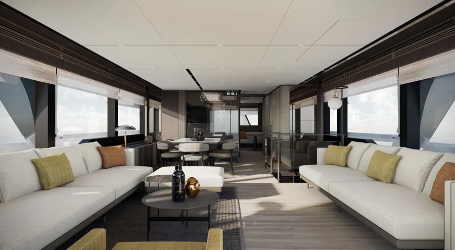 « Sans oublier les ambiances emblématiques de Ferretti Yachts : Classic, qui fait appel à des éléments terreux, et Contemporary, qui met en valeur des bois et des tissus brillants dans des teintes fraîches inspirées par les couleurs de la mer. Ces deux ambiances créent une esthétique sophistiquée dans des espaces fonctionnels et efficaces conçus pour des propriétaires qui considèrent de plus en plus leur yacht comme un nouveau lieu de vie, comme s’il s’agissait d’une extension de leur maison ».