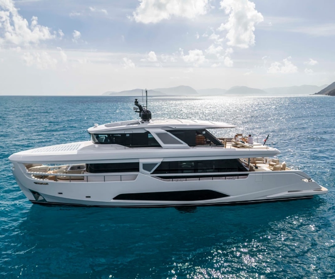 L’Infynito 80 peut être équipé d’une paire de moteurs Man V12 de 1 400 ch pour une vitesse de pointe de 23 nœuds et une vitesse de croisière de 18 nœuds, selon les données préliminaires, tandis que la coque à haut rendement permet d’atteindre une autonomie de 1 000 nm à 12 nœuds.