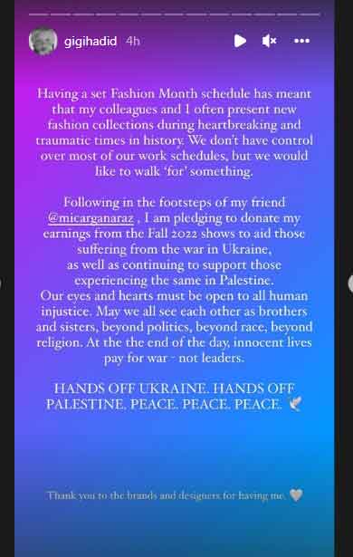 Plusieurs personnalités publiques se sont exprimées à ce sujet et tentent de lever le plus de fonds possible afin de venir en aide au pays en détresse. C’est le cas de Gigi Hadid qui s’est exprimé il y a quelques jours à ce sujet. Elle souhaiterait faire don de son salaire de la fashion week (qui se déroule en ce moment même à paris) à l’Ukraine et à la Palestine.
