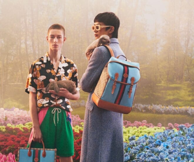 Mélange éclectique de couleurs, d’imprimés et de détails, la collection capsule de Gucci pour le Nouvel An chinois est une interprétation ludique du zodiaque de l’année : le lapin. Dans les collections hommes et femmes de la marque italienne, on trouve une sélection de blouses en soie et de chemises graphiques aux motifs géométriques audacieux et aux couleurs contrastées, ainsi qu’une itération spéciale de ses sacs à main emblématiques, comme les fourre-tout Gucci Diana et les sacs à bandoulière Horsebit 1955.