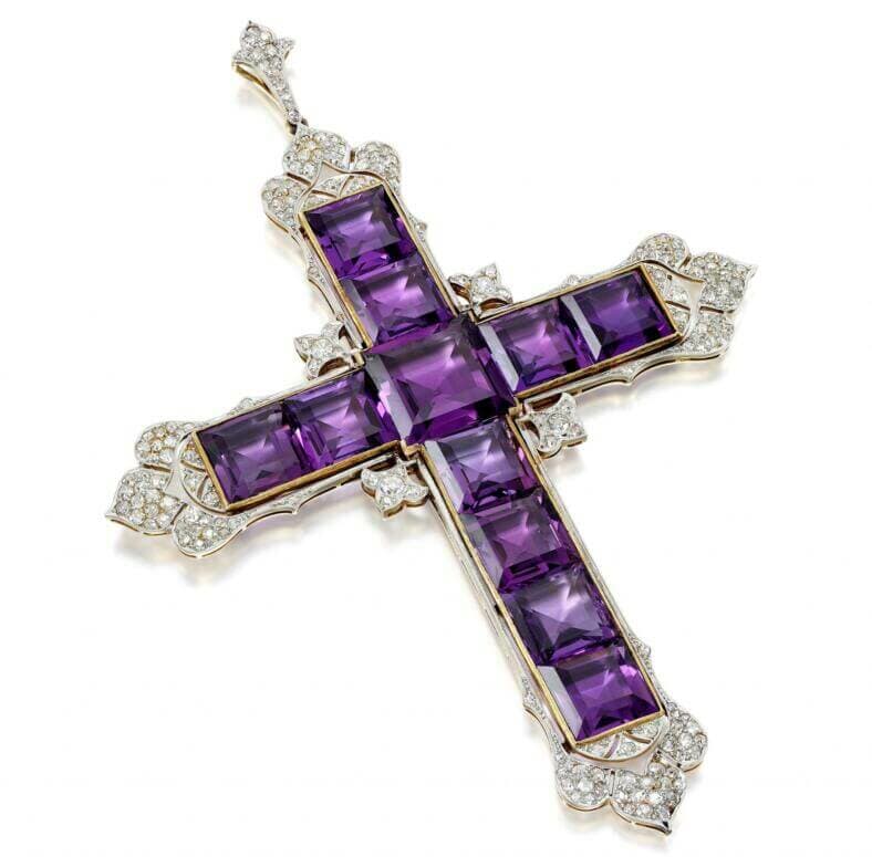 Le pendentif est composé de 11 améthystes de taille carrée montées en forme de croix et entourées de diamants de taille circulaire disposés selon un motif floral. Il mesure environ 5,4 pouces sur 3,7 pouces et le poids total des diamants s’élève à environ 5,25 carats.