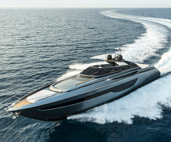 Le yacht a une vitesse de pointe de 32 nœuds et une vitesse de croisière de 28 avec une paire de moteurs MAN V12 en V de 1 550 ch, tandis que les options de 1 800 ch portent ces chiffres à 37 et 32 nœuds respectivement. Le profil aérodynamique de la coque gris requin aux accents contrastés noir brillant présente désormais davantage de vitrages, tandis que les nouveautés sont nombreuses en termes d’innovation numérique, de fonctionnalité et de stockage.