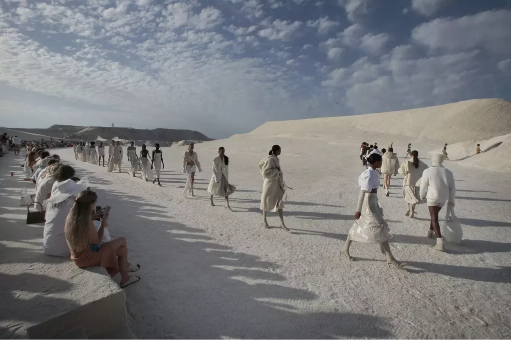 Cette année, pour présenter la collection automne/hivers de la maison française appelée “Le Papier”, le styliste a organisé son défilé sur d’impressionnantes dunes de sel de Salin-de-Giraud à perte de vue, qui donne l’impression d’être sur la lune ou sur mars.