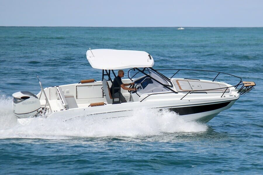 Les options du Flyer 8 comprennent le remplacement de la banquette arrière par un poste de pêche avec une banquette rabattable, un puits à appâts vivants, deux coffres de rangement et cinq porte-cannes supplémentaires. D’autres options comprennent un arc de remorquage arrière, idéal pour le ski nautique ou toute autre activité de remorquage, tandis qu’un parasol peut être fixé au T-top rigide.