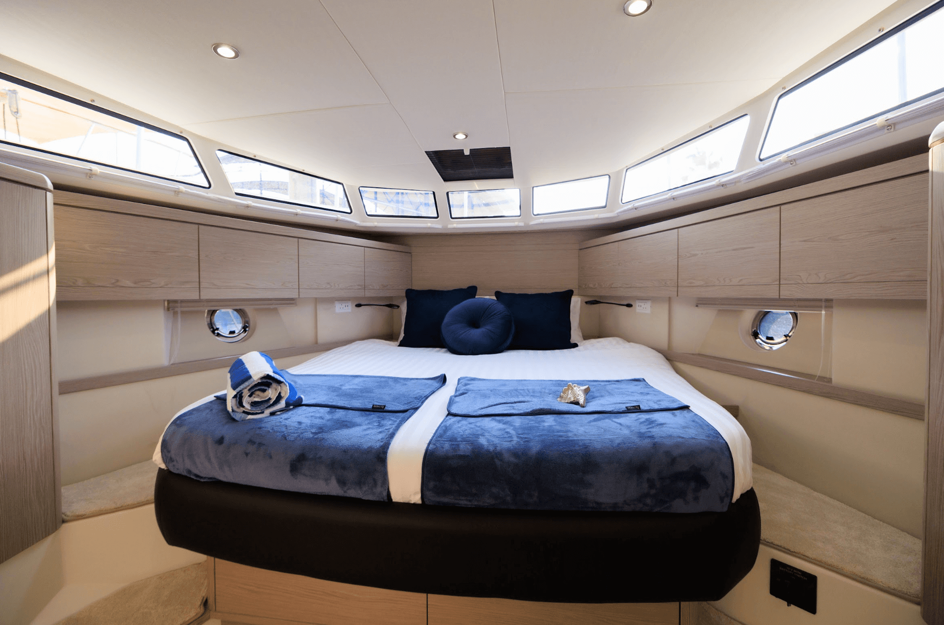 La porte latérale de la timonerie ajoute à l’aspect pratique et permet des manœuvres plus sûres dans tout le bateau. Le design intérieur est conçu avec le souci du détail. Sous le pont, le Greenline 40 offre des couchages confortables avec une cabine propriétaire spacieuse et une cabine invités bien aménagée. Les matériaux de haute qualité, y compris les armoires en bois à grain fin, contribuent à donner une impression de chaleur et de luxe.