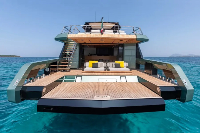 Parmi les autres points forts du Diva, citons le club de plage, doté de grands pavois abaissables qui créent des terrasses latérales et augmentent la largeur du yacht de 6 à 9 mètres.