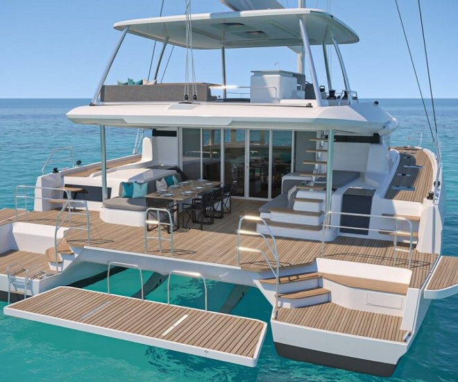Comme le Lagoon 55, le Lagoon 60 dispose d’un cockpit à l’infini, où seuls des garde-corps séparent le pont arrière et la plateforme de plage hydraulique, avec comme nouveauté des côtés abaissables de part et d’autre. Le côté bâbord de la zone couverte du cockpit permet de prendre des repas en plein air, tandis que le côté tribord est équipé d’un lit de jour et de marches menant au flybridge.