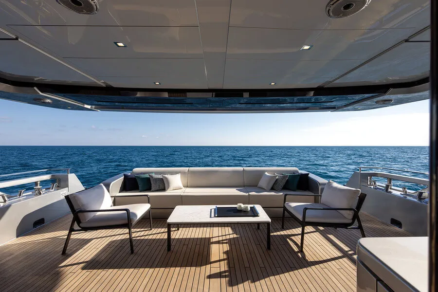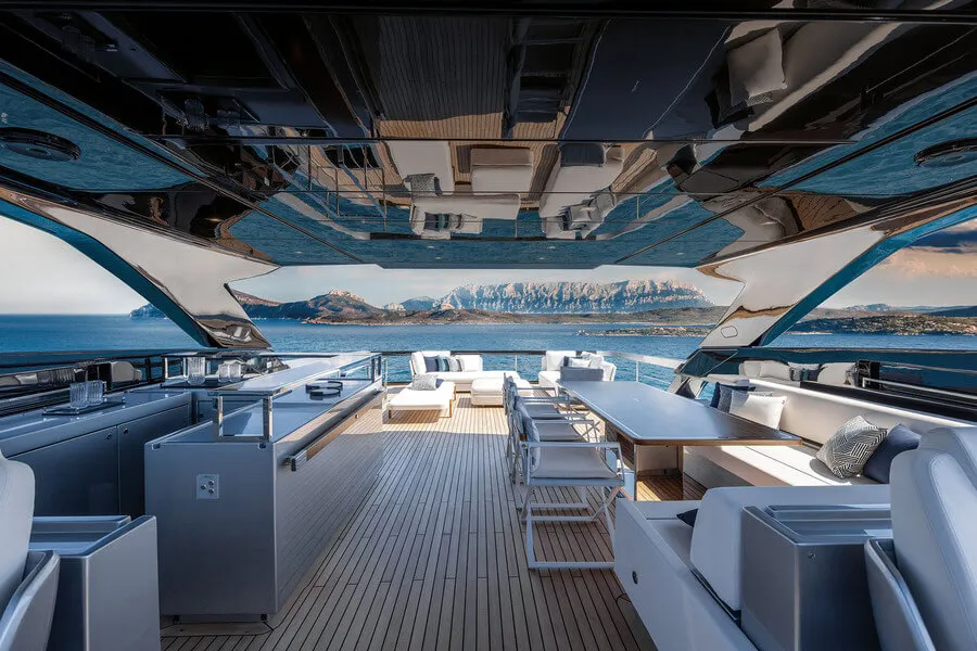Le studio de design a cherché de nouvelles solutions pour moderniser un modèle populaire, en particulier dans la zone arrière. « Nous avons aplati la forme de la poupe et l’avons abaissée », explique Michelli. « Le résultat était une sorte de terrasse, créant un espace supplémentaire à l’arrière que le Corsaro de 100 pieds n’avait pas.