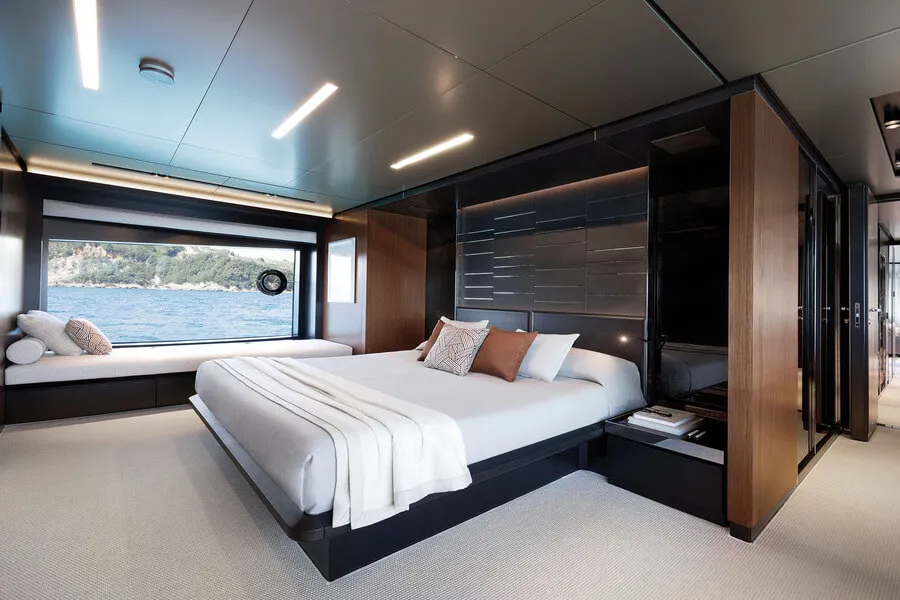 La cabine du propriétaire à poutres pleines est apparue pour la première fois sur le Corsaro 100′. « Dans le Corsaro Super 102′, nous avons voulu conserver cette disposition, en l’améliorant encore en agrandissant le vitrage », explique De Vivo.