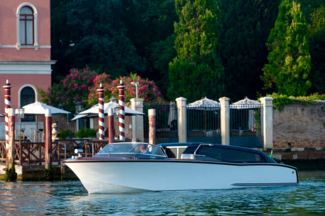 Construit par Cantieri Vizianello à Venise, le taxi nautique de luxe de 9,2 m a été conçu par Carlo Nuvolari et Dan Lenard, qui ont organisé un forum au salon nautique de Venise l’année dernière afin de discuter de la conception d’une embarcation hybride de luxe qui pourrait contribuer à résoudre le problème de pollution de la ville.