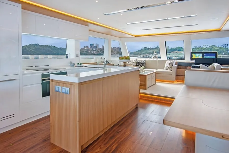 Comme pour tous les modèles de catamarans ILIAD, l’aménagement intérieur peut être personnalisé pour répondre aux besoins et aux styles de chacun. Il est possible d’ajouter des espaces de réfrigération et de congélation, d’aménager des cuisines plus ouvertes, de personnaliser les finitions en bois et la tapisserie, de modifier l’agencement des cabines et d’inclure des entrepôts, des bureaux et des buanderies.