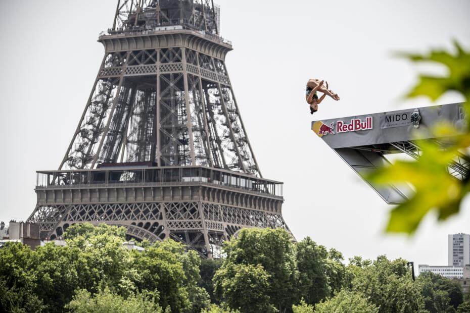 Avant d’en arriver là, les Red Bull Cliff Diving World Series se sont fait un nom avec des lieux spectaculaires et inattendus par le passé. Nous avons par exemple interviewé Franz Linder, PDG de Mido, lors de l’étape de Bilbao en 2019 ; Mido est le partenaire officiel de performance des Red Bull Cliff Diving World Series depuis cette année-là, et la compétition elle-même existe depuis 2009. L’idée est assez simple : des athlètes extraordinairement talentueux et courageux plongent d’une plateforme en plein air pouvant atteindre 27 m de haut, avec seulement leurs compétences pour assurer leur sécurité. Dans le cas de l’étape parisienne de cette année, cette plateforme a été érigée sur les rives de la Seine, en face de la Tour Eiffel.