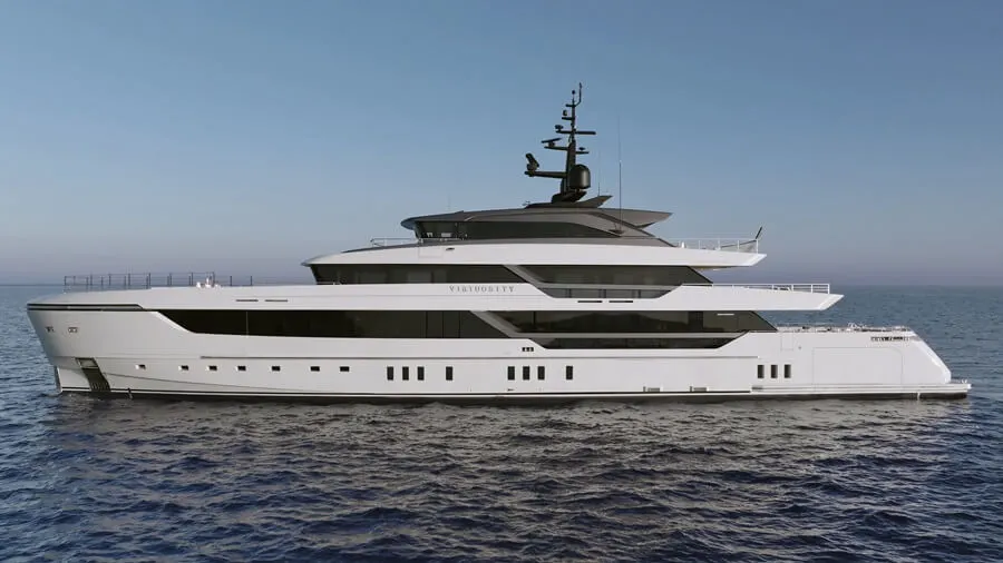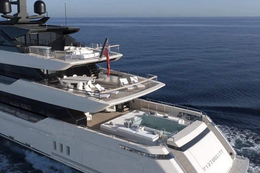 Rossi dit : « Virtuosité arbore une couleur unique, donnant à la ligne un aspect plus sportif, comme le souhaitait le client. Un autre élément extérieur distinctif est la piscine privée sur le pont avant. VirtuositéLe pont supérieur de Virtuosity est situé devant la cabine du propriétaire ». Une telle personnalisation témoigne de la quête de Sanlorenzo, et de la devise de l’entreprise, de créer des yachts « sur mesure ».