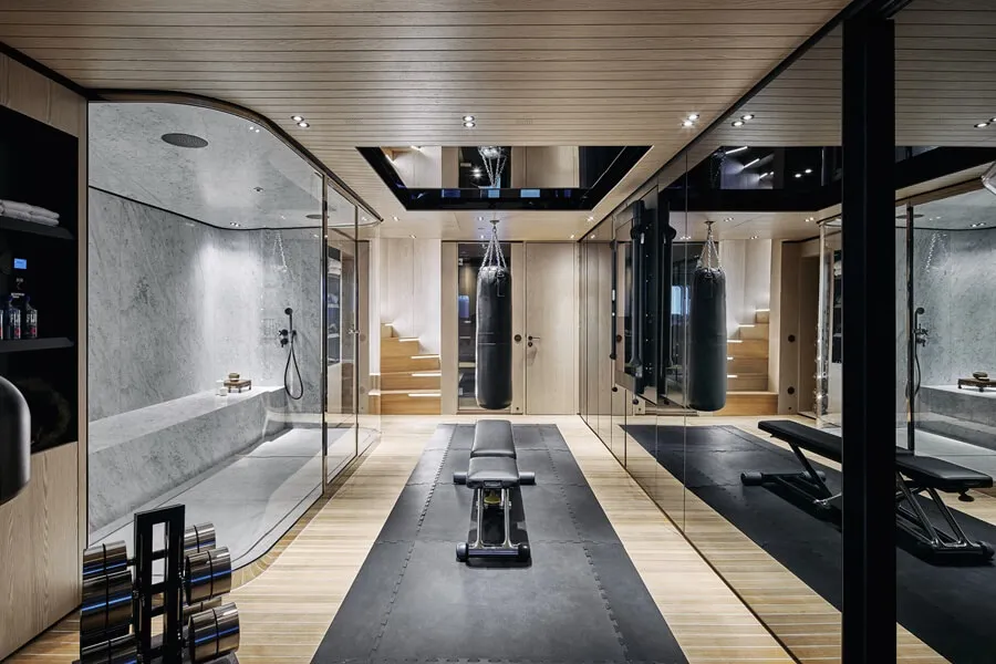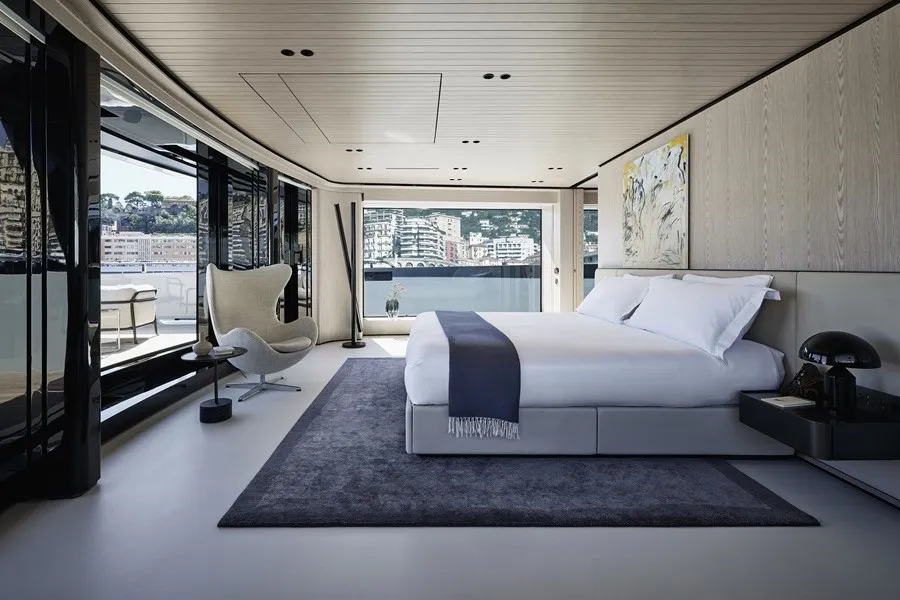 Un point de vue plus élevé pour le pont n’est pas seulement un avantage pour le capitaine, mais cette modification de l’arrangement général a permis au pont supérieur d’accueillir une vaste suite du propriétaire de 54 m², comme on pourrait en trouver sur un yacht avec une longueur hors tout plus importante.