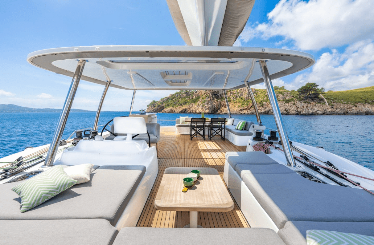 La terrasse arrière, avec sa grande table modulable et ses ailes rabattables – facilitant l’embarquement à quai – est une réussite. Quant à la plate-forme de bain pleine largeur, elle est incontournable. Le carré est tout aussi convaincant, surtout dans la version avec cuisine abaissée. L’espace comprend un comptoir/bar, moitié extérieur et moitié intérieur, où tous les invités à bord peuvent se retrouver pour une collation, ce qui est tout simplement génial. La table et le canapé sont très confortables et bénéficient d’une vue imprenable sur la mer.