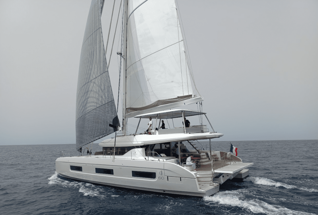 Voiles réglées, notre multicoque s’élance dans une légère houle. Nous avons gardé un œil sur le GPS pour suivre l’accélération, et le Lagoon 60 s’est finalement stabilisé à 8 nœuds, malgré un vent réel qui ne dépassait pas les 10 nœuds.