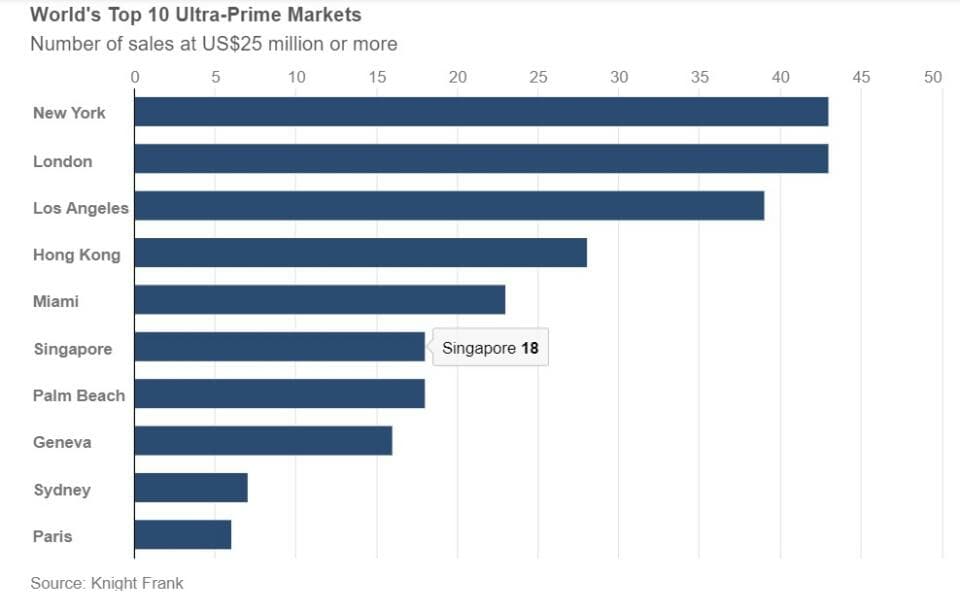 Los Angeles arrive en troisième position avec 39 achats d’une valeur de 25 millions de dollars ou plus. Bien que son marché immobilier ait connu une année agitée, Hong Kong est arrivée en deuxième position avec 28 ventes d’ultra-prime, suivie de Miami avec 23. Ces villes ont également enregistré le plus grand nombre de ventes de 10 millions de dollars américains ou plus en 2022, ce qui n’est pas inattendu. Selon le rapport, New York est arrivée en tête de liste avec 244 ventes dans cette gamme de prix, suivie de Los Angeles avec 225 et de Londres avec 223.