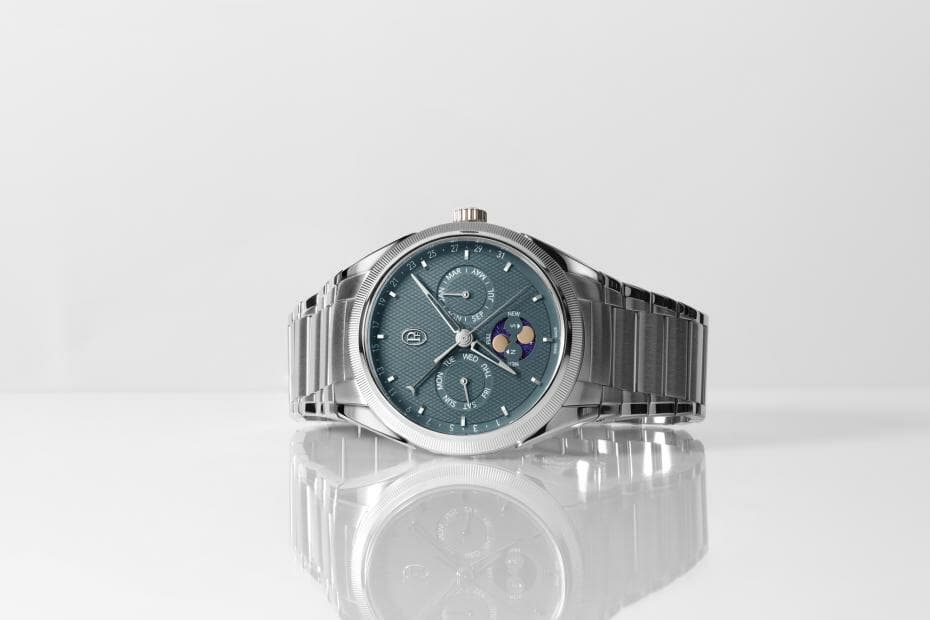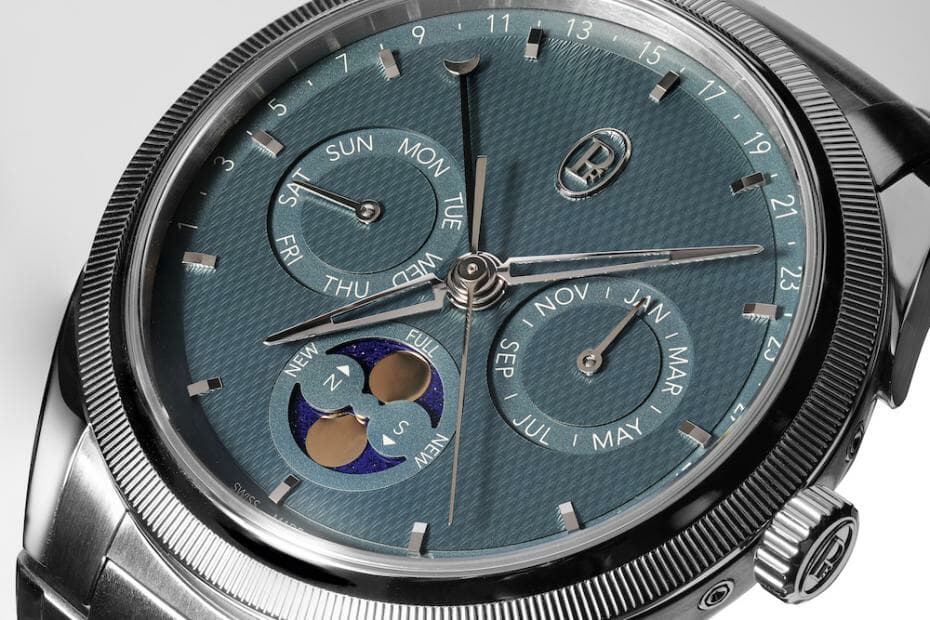Nous avons écrit l’année dernière que la collection Parmigiani Tonda PF présentait une rareté absolue pour la marque – un calendrier annuel sans chronographe. Bien qu’il puisse sembler étrange de s’enthousiasmer pour une approche moins compliquée, l’encombrement du cadran est réel et peut trop facilement gâcher l’expérience de porter une belle montre. Il peut également rendre déraisonnablement difficile la lecture de la date, qui se trouve être ici sous forme rétrograde… Elle est affichée par une aiguille en forme de croissant de lune qui pointe vers une piste de date entre 8 et 4 heures. Les jours de la semaine, le mois et les phases de la lune sont affichés à 9 heures, 3 heures et 6 heures, respectivement, dans des cadrans secondaires légèrement en retrait. Cela permet de garder les choses bien rangées, ce qui est parfois un défi avec les cadrans secondaires. Il n’est pas difficile de constater que cette approche du calendrier annuel n’est pas propre à la Tonda PF, mais l’effet tend à être très différent.