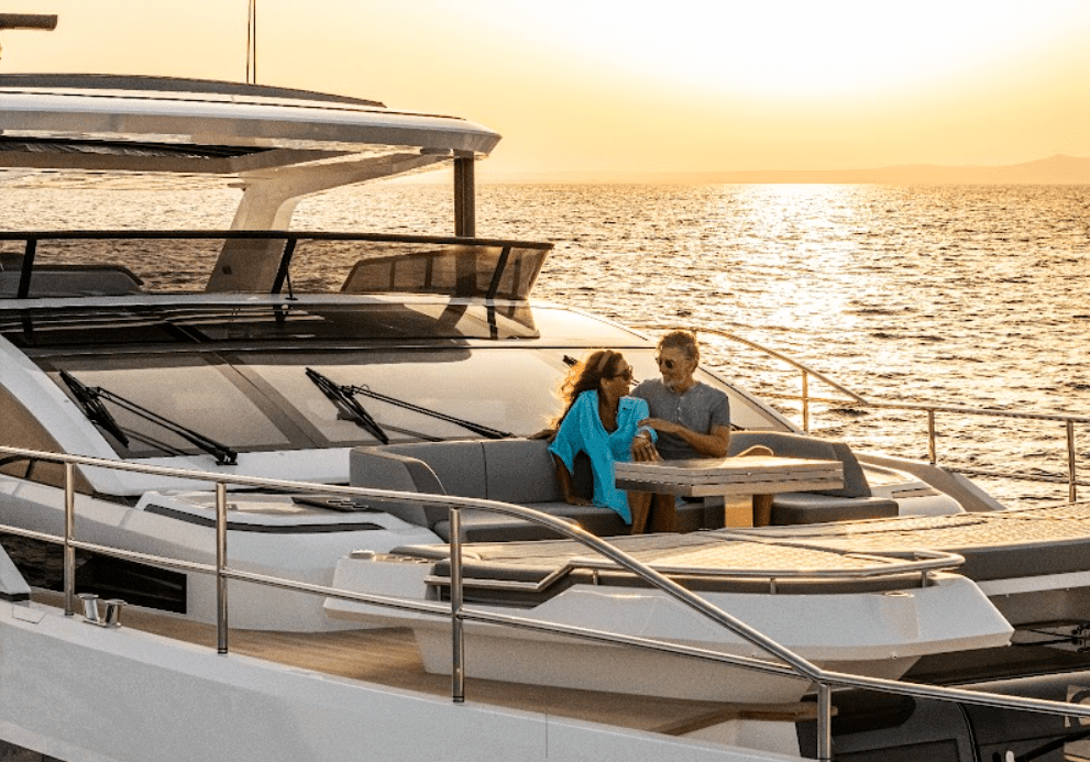 Les deux configurations du pont arrière renforcent encore la polyvalence du yacht : Riviera et Veranda. La configuration Riviera offre des bains de soleil à l’arrière de la salle à manger, parfaits pour prendre un bain de soleil, tandis que l’option Veranda offre des sièges adaptables qui peuvent pivoter entre un cadre de pique-nique et un arrangement de patio plus intime. Les deux configurations sont dotées de pavois rabattables, ce qui permet d’agrandir l’espace du cockpit et de créer une connexion transparente avec l’environnement.