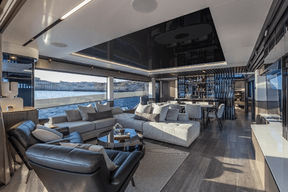 Le salon est doté de fenêtres allant du sol au plafond qui maximisent la sensation d’espace et inondent la zone de lumière naturelle. L’aménagement ouvert comprend une salle à manger pour 10 personnes, un bar élégant et un salon qui invite à la détente. Les matériaux utilisés, tels que le bois richement veiné, l’onyx et les tissus d’ameublement dans des tons neutres, créent une atmosphère de sophistication et de confort.