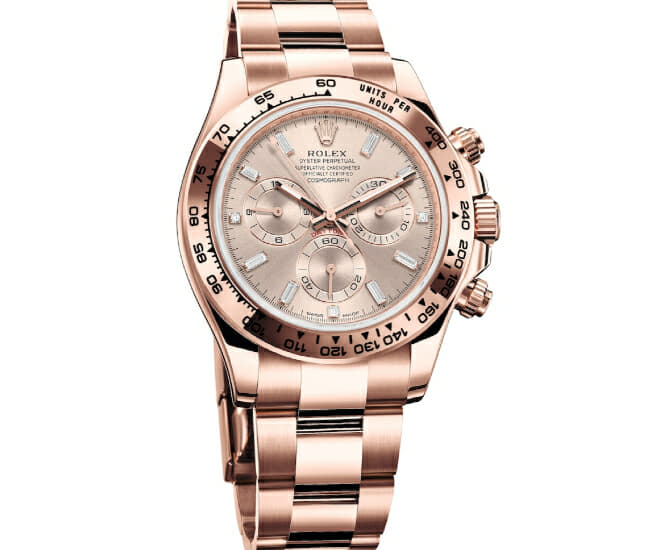 Oyster Perpetual Cosmograph Daytona en or Everose 18 ct, avec un cadran sundust, serti de diamants et un bracelet Oyster.