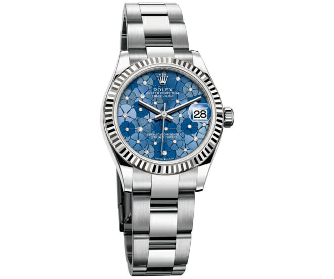 Oyster Perpetual Datejust 31 en Oystersteel et or blanc 18 ct avec un motif floral bleu azur, un cadran serti de diamants et un bracelet Oyster