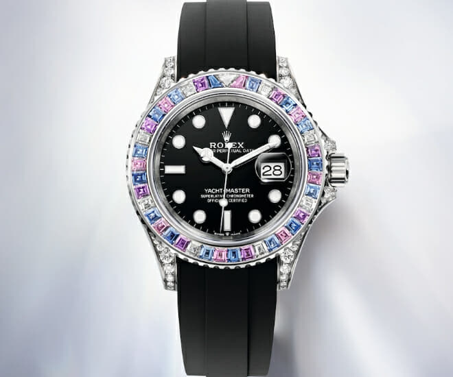 Capturant la beauté éphémère des aurores boréales, l’Oyster Perpetual Yacht-Master 40 présente un anneau de diamants le long de sa lunette, disposés selon une séquence harmonieuse de cinq teintes répétées huit fois. Cette montre, qui ne manquera pas de faire parler d’elle lorsqu’elle sera portée, est l’incarnation même du prestige rayonnant.