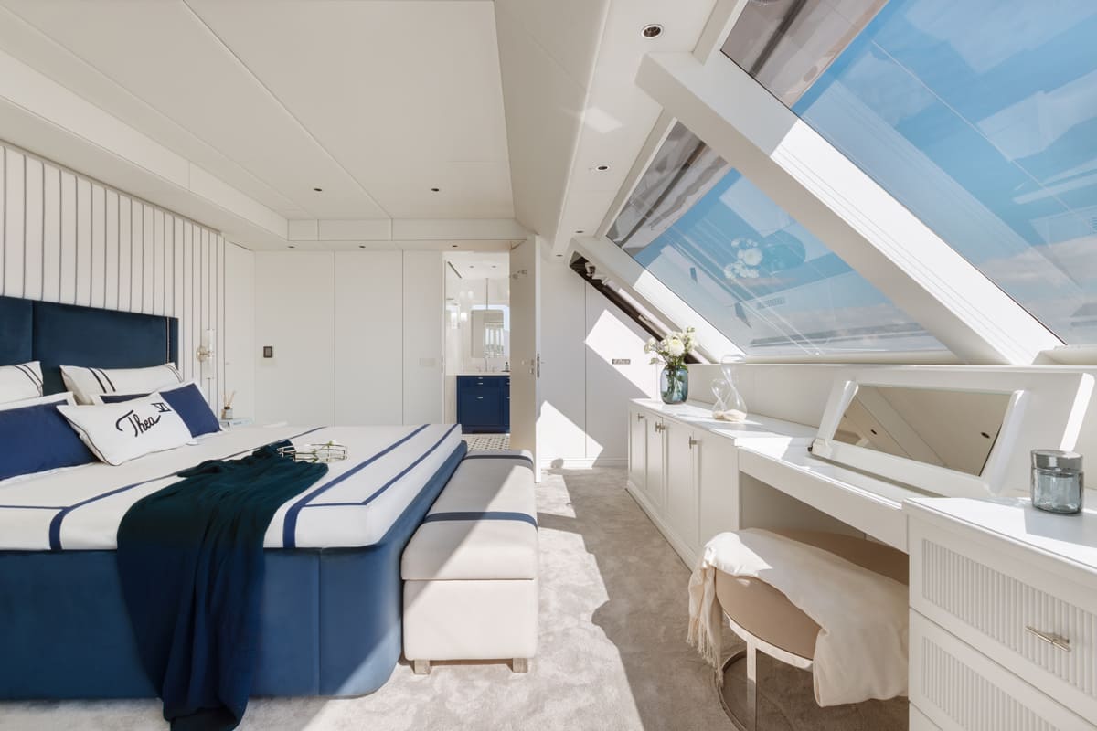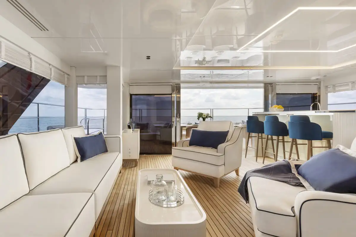 L’une des caractéristiques les plus remarquables du yacht est le flybridge partiellement fermé, qui abrite un salon de cigares personnalisé et une télévision de 85 pouces. Le club de plage de 16 mètres de large est un autre point fort, avec des plates-formes pliables et un garage arrière invisible qui permet d’accéder facilement aux jouets nautiques et à l’équipement de plongée.