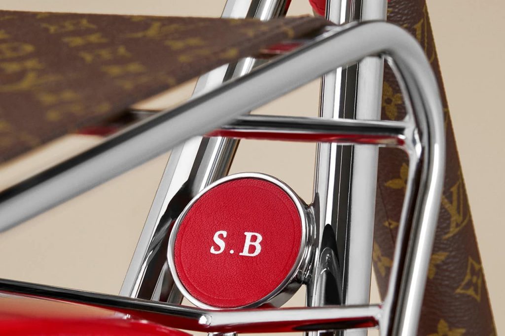 L’unique LV Bike bénéficie également de quelques touches old-school, comme l’incorporation de bois pour les garde-boue et des jantes à rayons doublées d’une superbe garniture de roue en bois rouge et blanc de marque LV.