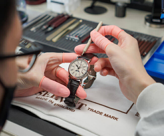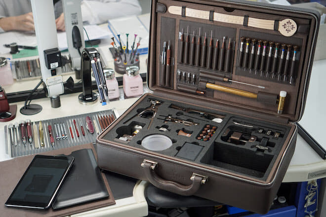 Quant au service complet, il comprend les éléments suivants, selon la marque : démontage complet et inspection de toutes les pièces ; remplacement des pièces usées ; nettoyage, assemblage, lubrification et calibrage du mouvement ; ajustement du cadran et des aiguilles ; test d’étanchéité ; test complet et contrôle de la qualité du travail une fois terminé. Encore une fois, les réparations seront effectuées si nécessaire et non pas comme une évidence. De même, le polissage n’est effectué que si le propriétaire de la montre le demande. Patek Philippe nous dit que la préoccupation première des horlogers est le fonctionnement de la montre, et non l’esthétique.