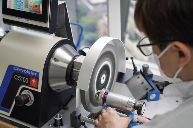 Si l’assemblage et le désassemblage des mouvements, ainsi que leur huilage, ont constitué le point fort de la visite, ce sont les activités de polissage du centre de service qui nous ont le plus impressionnés. Deux spécialistes travaillent ici au polissage des boîtiers, et chacun d’entre eux a plus de 20 ans d’expérience. Ce travail est toujours effectué à la main et prend le temps qu’il faut. Le polissage d’un boîtier en or peut prendre jusqu’à une heure et demie, celui du bracelet dans le même métal jusqu’à deux heures. Le platine est de loin le métal le plus difficile à polir, chaque boîtier nécessitant jusqu’à quatre heures.