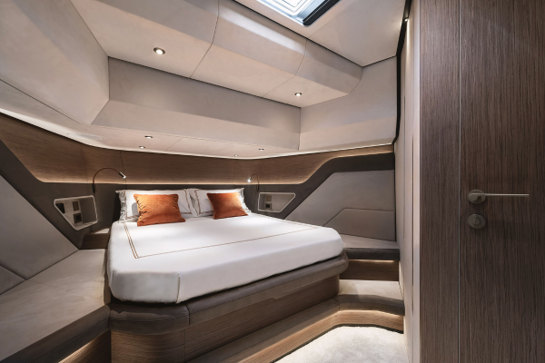 Sous l’extérieur élégant et bas du WiLder 60 se cachent des intérieurs accueillants. La laque brillante, les inserts en bronze et le parquet en chêne sont synonymes de confort et de luxe, où les tons neutres et chauds se mêlent aux gris froids et aux accents noirs. Ces derniers se retrouvent notamment dans les comptoirs Krion café crème des salles de bain, aux côtés de lavabos en cristal gris et de robinets Gessi à finition noire, et se poursuivent dans les finitions en cuir et en marbre.
